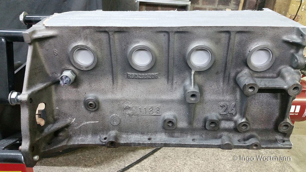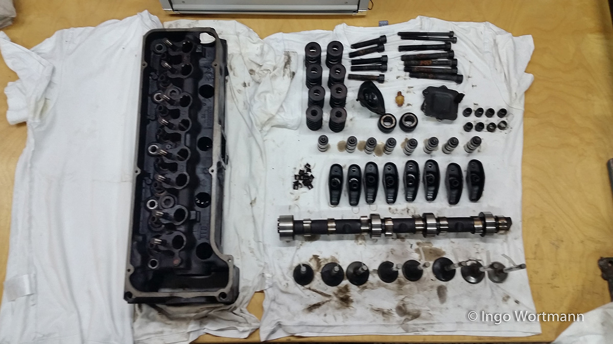 Und wenn ich schon dabei bin, nehme ich auch gleich den Zylinderkopf und die Ölwanne ab. Den Zylinderkopf habe ich sofort in all seine Einzelteile zerlegt, denn dieser sollte umgehend zur Firma RISSE zwecks Überholung/Bearbeitung. Dann habe ich die Kolben im noch eingebauten Zustand vom Ruß befreit (Backofenspray ist ein hervorragendes Reinigungsmittel dafür! Einsprühen, 30min warten und sich auf ein tolles Ergebnis einstellen.)